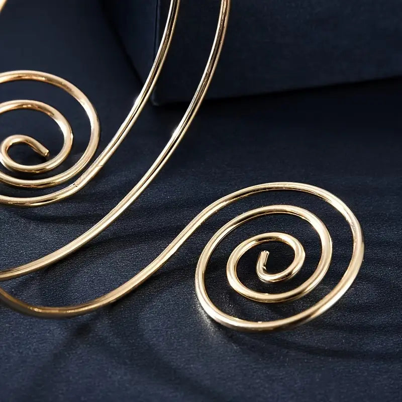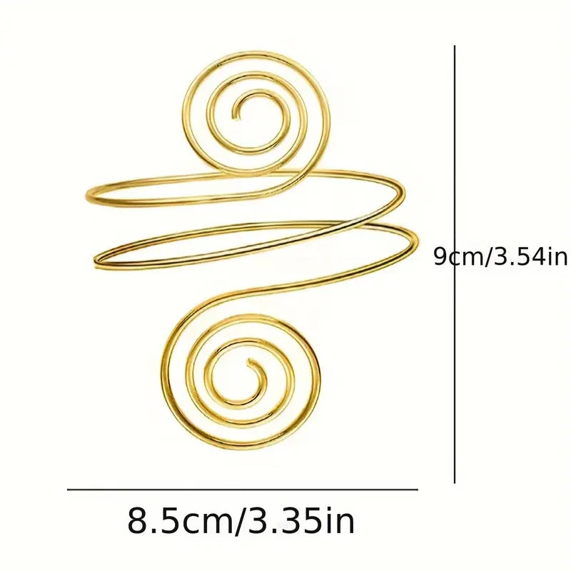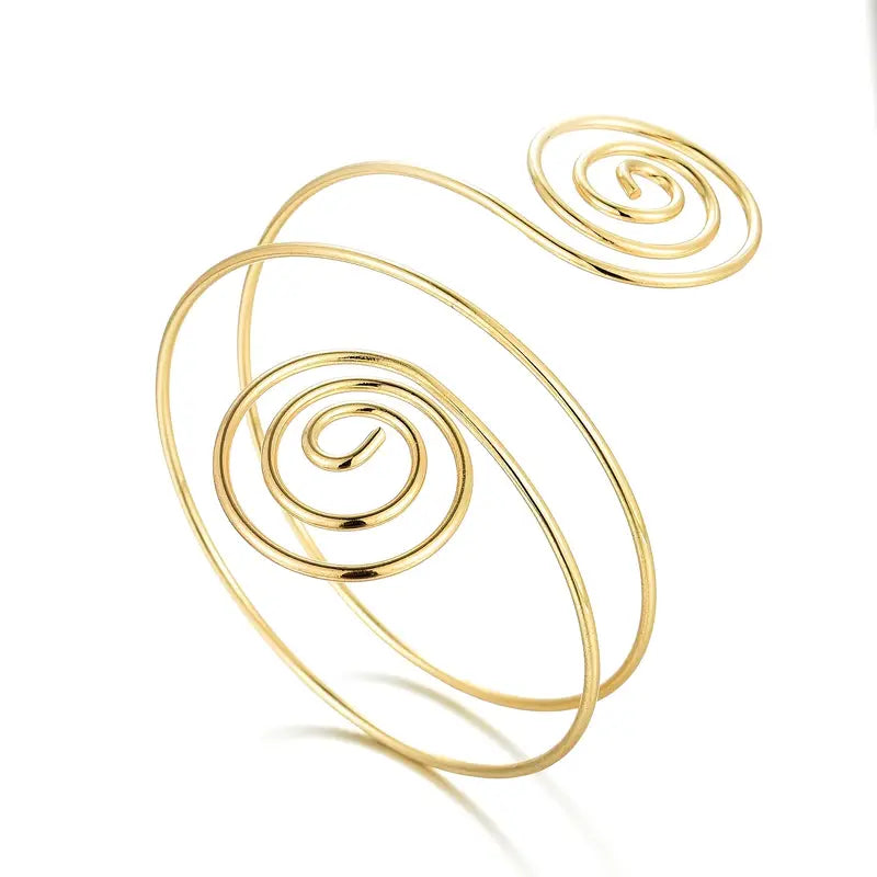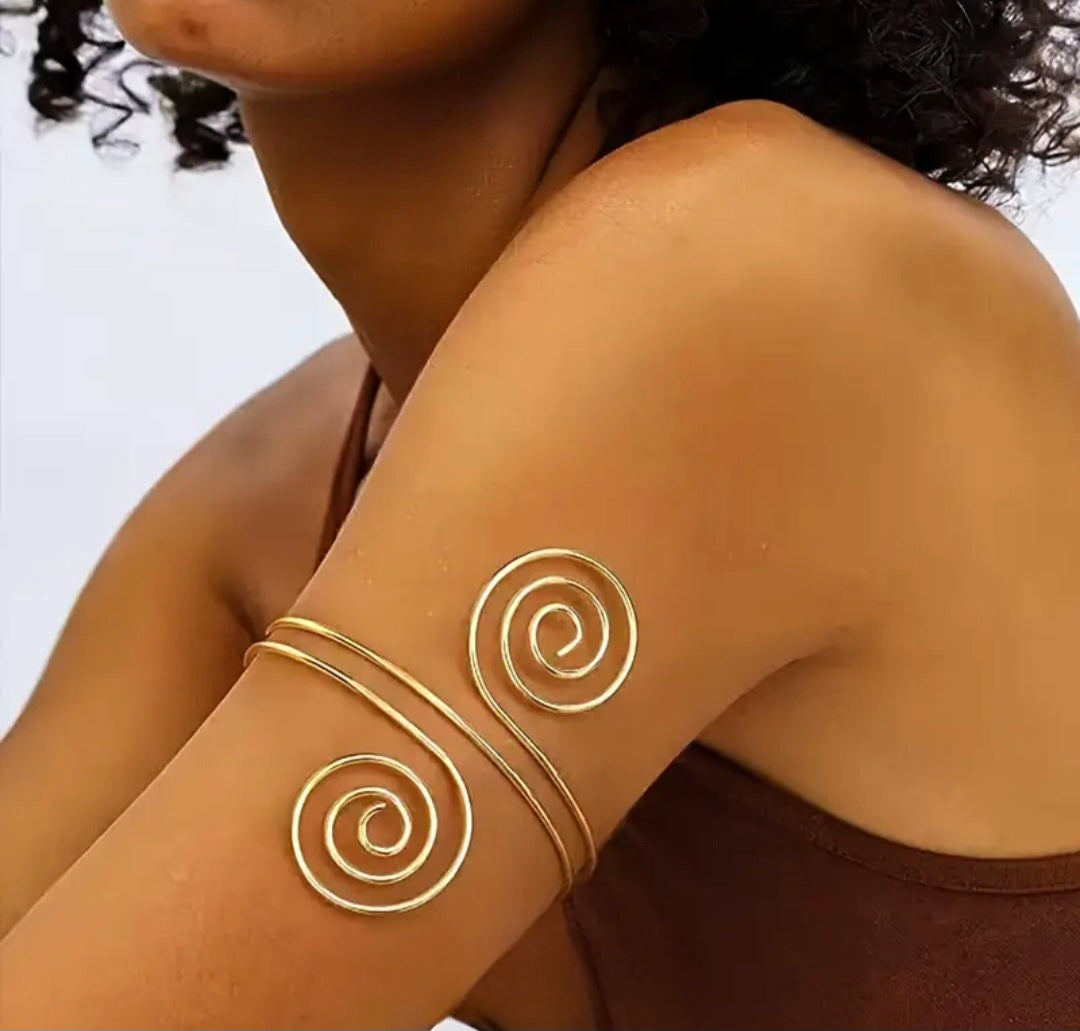 A gold arm cuff with twin spiral designs, bringing a touch of artistic charm and bohemian flair to your style.