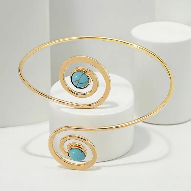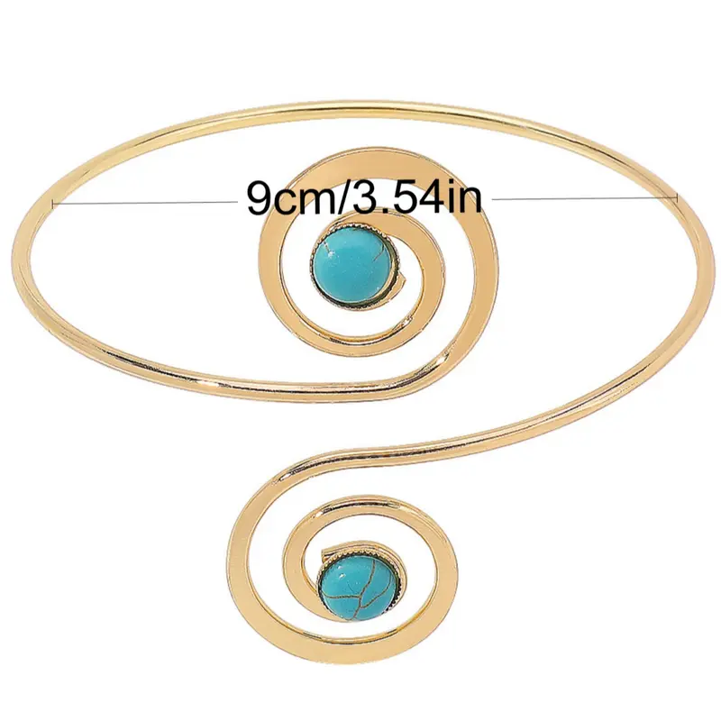 A bold gold spiral arm cuff with turquoise accents, blending artistic charm with a modern boho vibe.