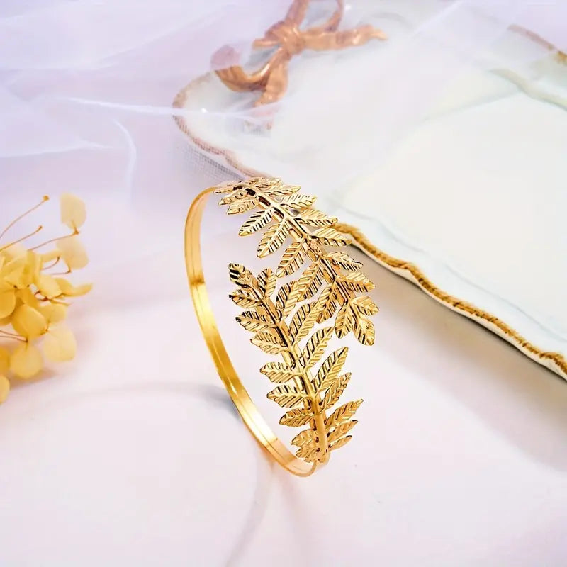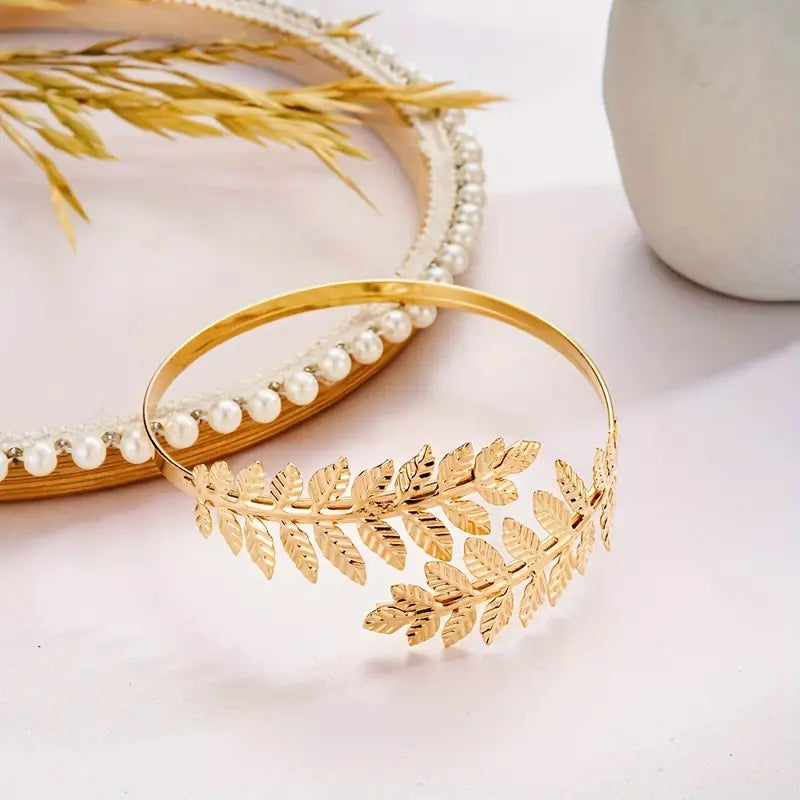 A chic gold-tone leaf arm cuff that adds a touch of boho elegance to any look.