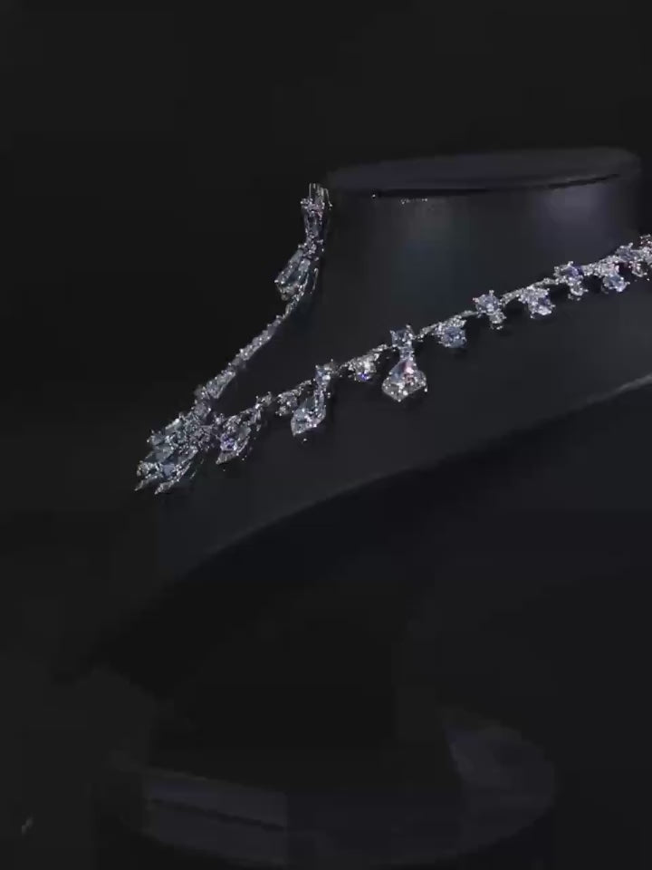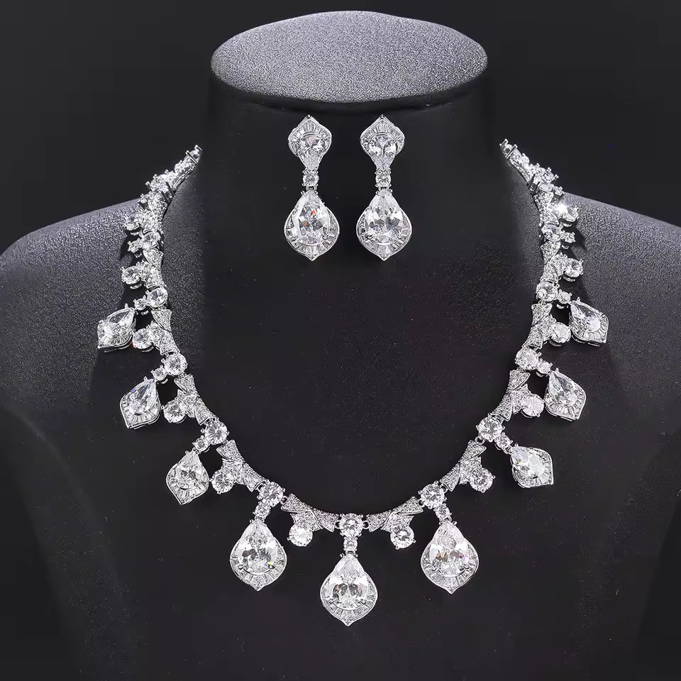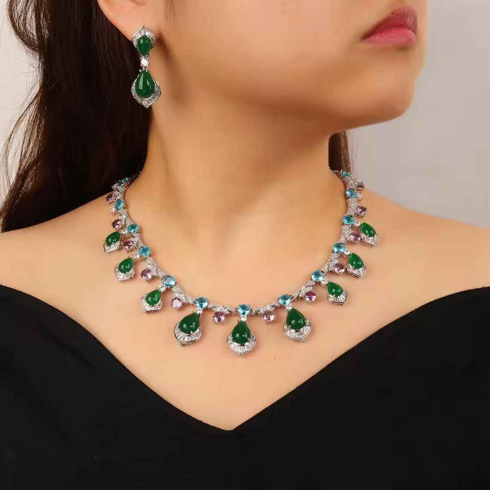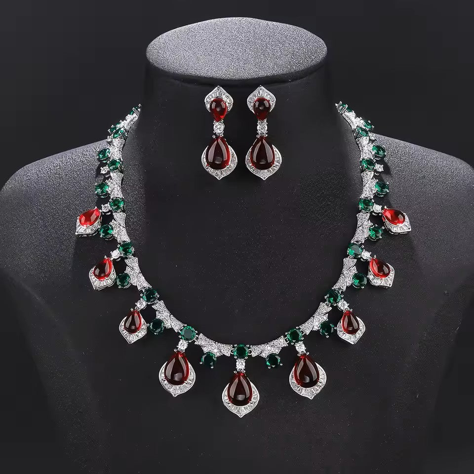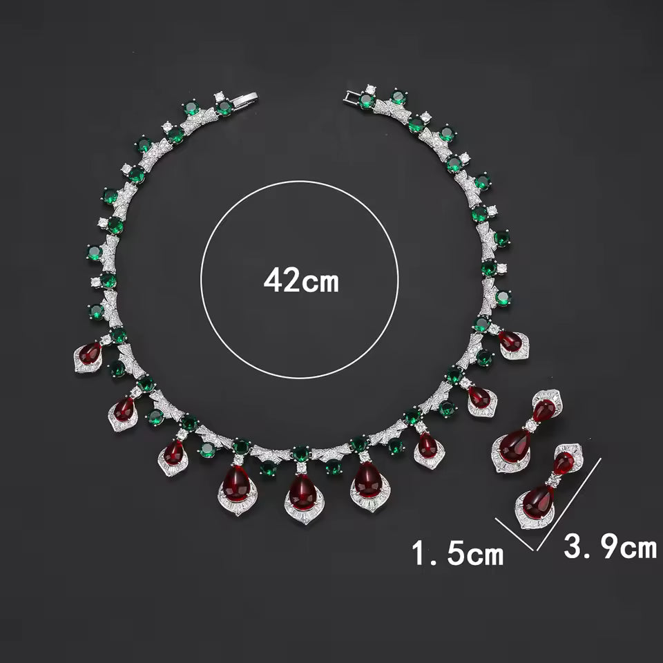A striking necklace and earring set featuring deep red teardrop stones accented with rich green gems, embodying regal elegance and bold sophistication.