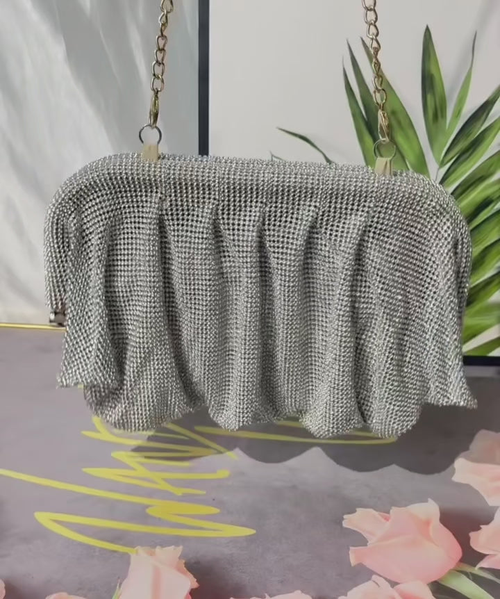 Crystal-mesh pleated evening bag with a sleek chain strap—soft-structured and lightweight; it catches the light from every angle for a high-impact glow in a compact silhouette.