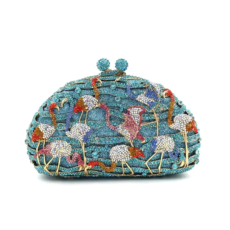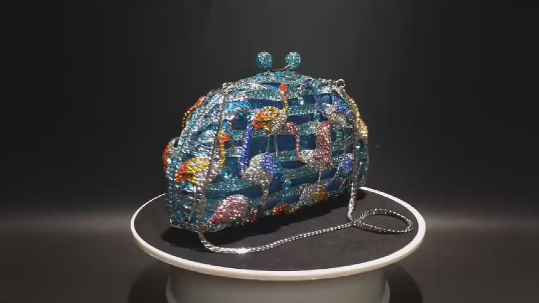Ocean-blue crystal pavé clutch with sculpted wave texture and a jewel-topped kiss-lock. Multicolor bird motif in pink, white, and cobalt with gold-tone accents—an artful statement piece. Rigid hard case that keeps its shape and carries the night’s essentials.