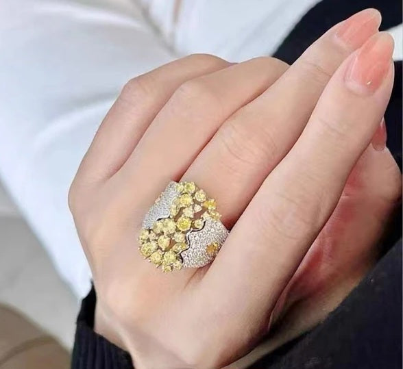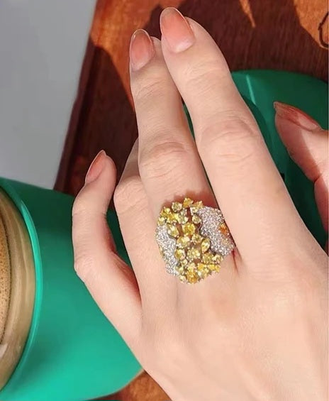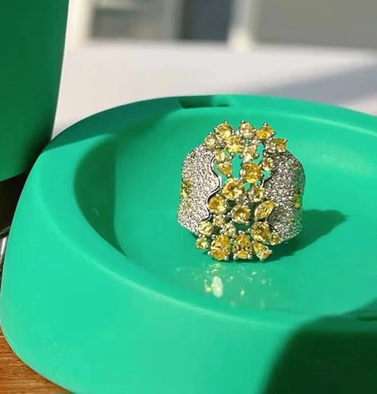 Sterling silver ring embedded with zircon in natural golden yellow and diamond color.