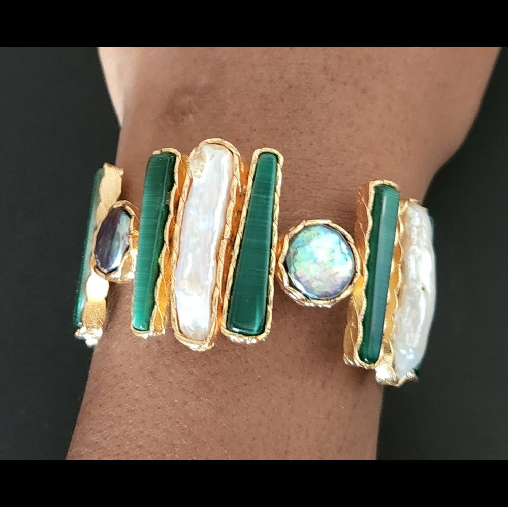 High quality bracelet with embedded real mother of pearls. Bracelet has 18k gold polish and is adjustable.
