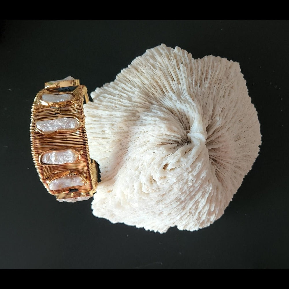 High quality bracelet with embedded real mother of pearls. Bracelet has 18k gold polish and is adjustable.