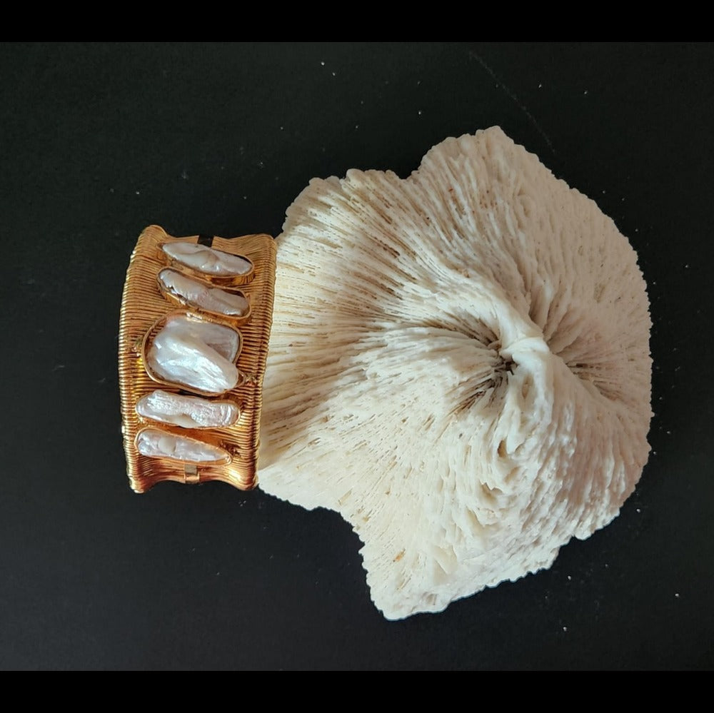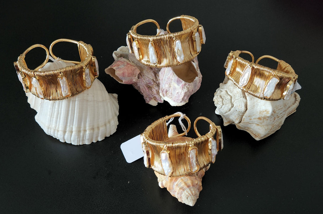 High quality bracelet with embedded real mother of pearls. Bracelet has 18k gold polish and is adjustable.