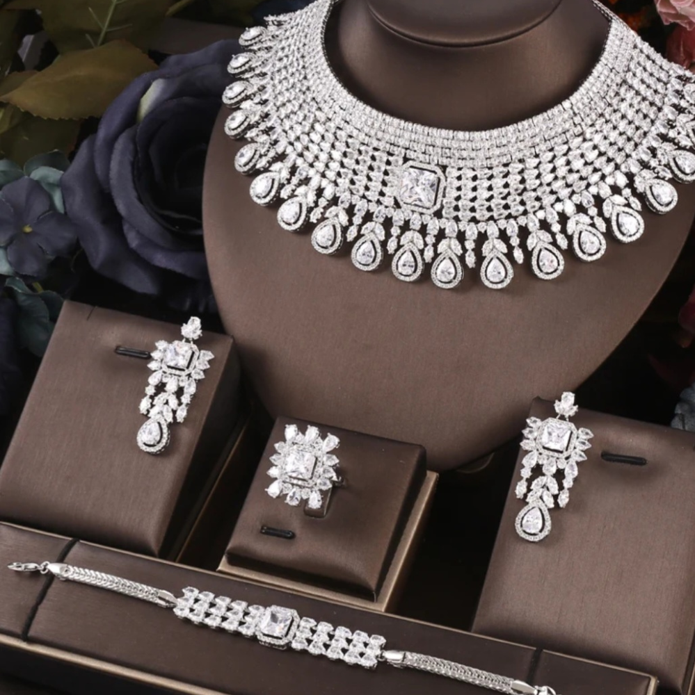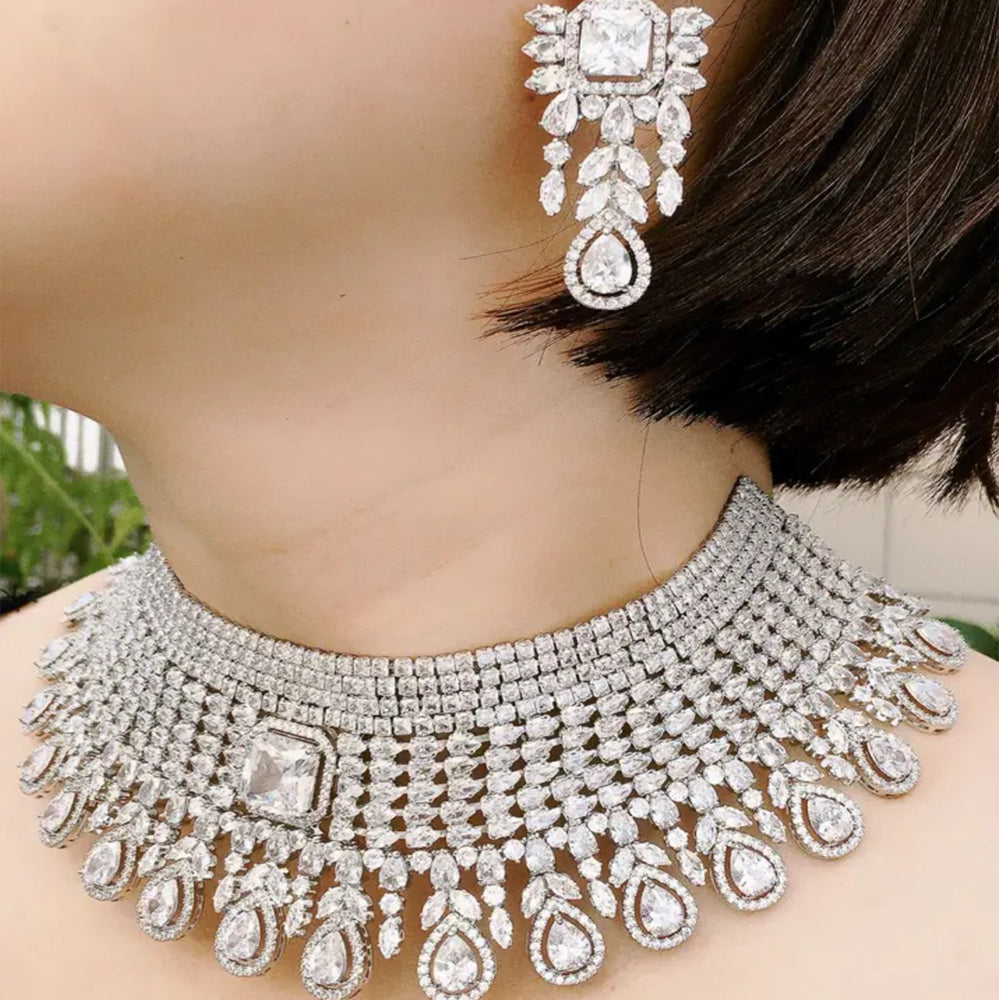 Choker set for weddings and parties. Beautiful clear white zircon gives a most elegant look. Includes bracelet, earrings, ring, necklace.