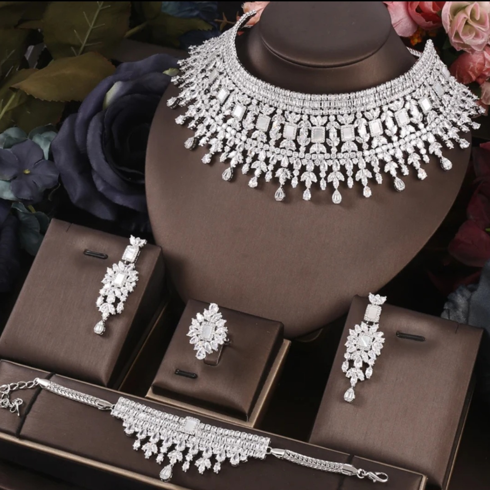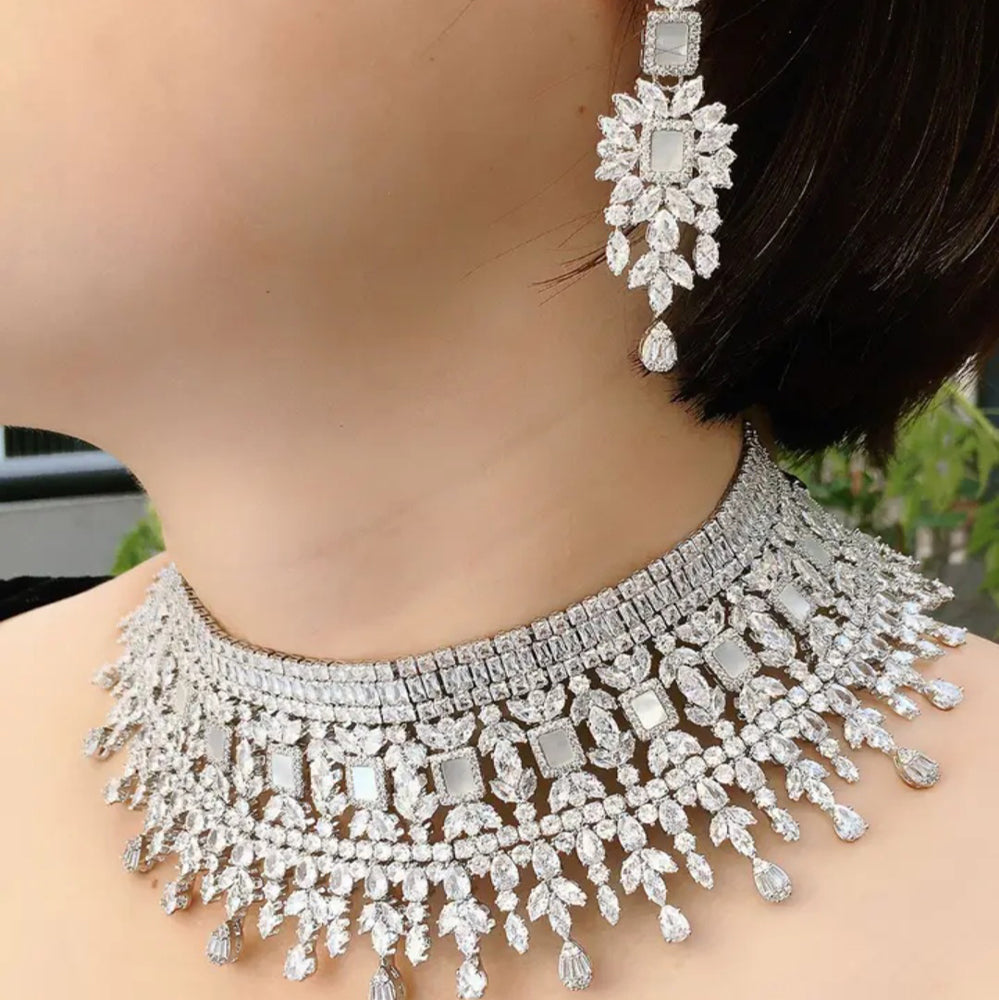 Choker set for weddings and parties. Beautiful clear white zircon gives a most elegant look. Includes bracelet, earrings, ring, necklace.