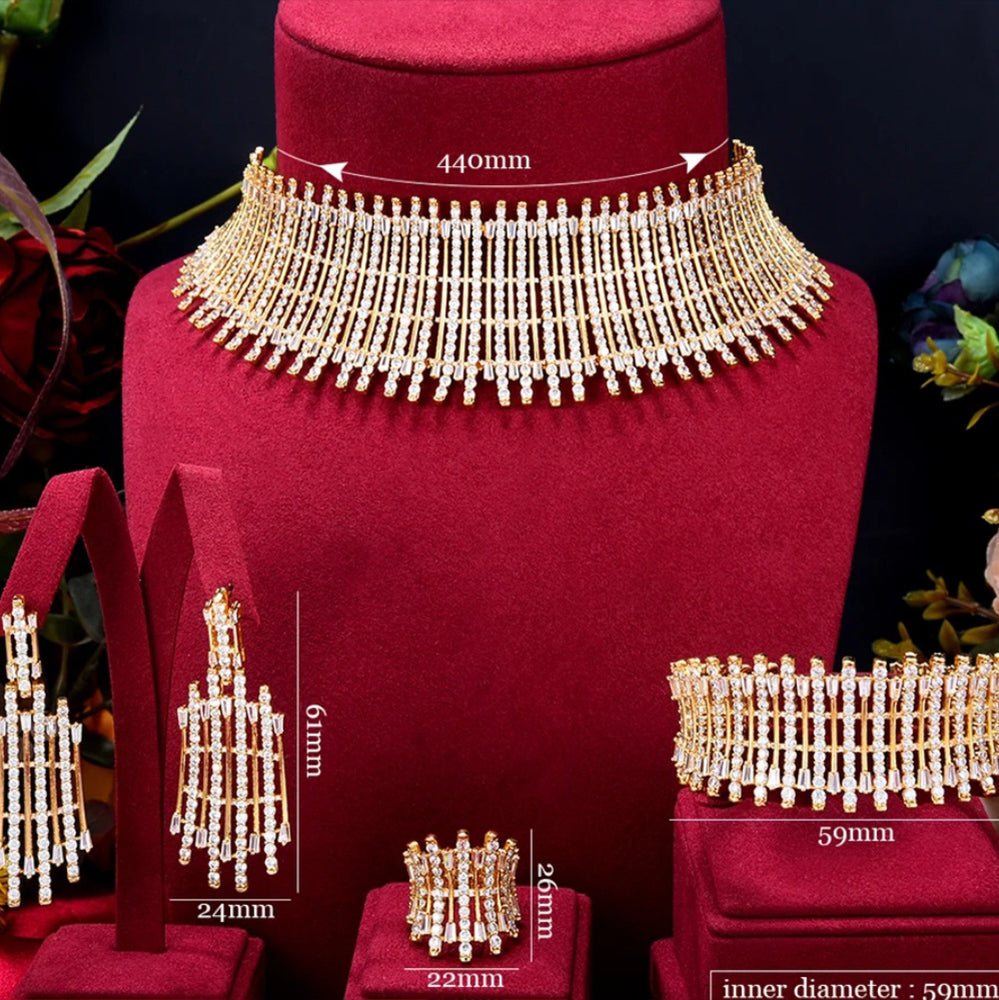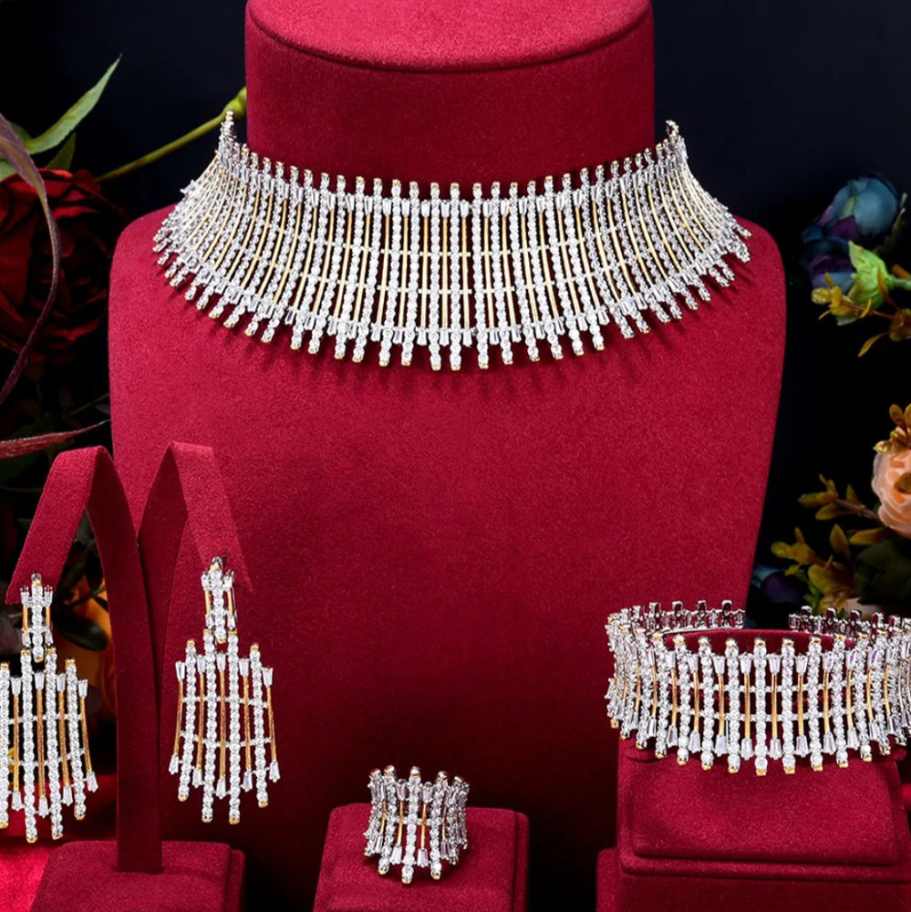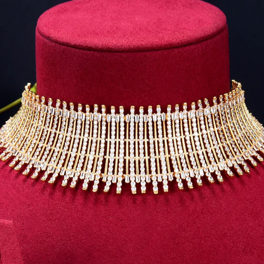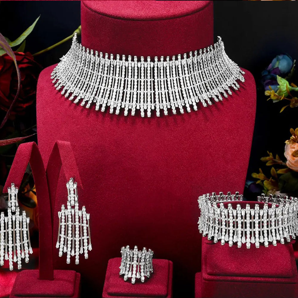Choker set for weddings and parties. Beautiful clear white zircon gives a most elegant look. Includes bracelet, earrings, ring, necklace.