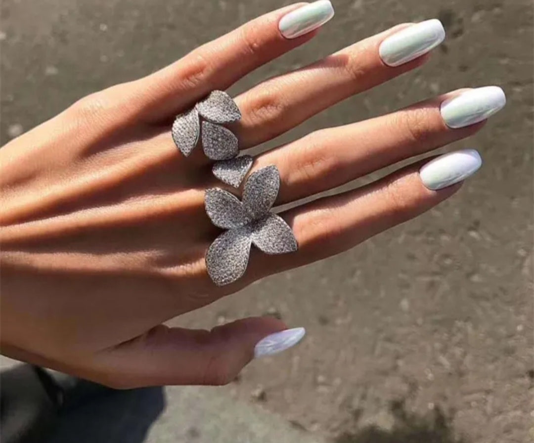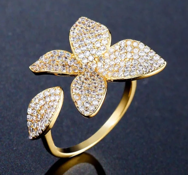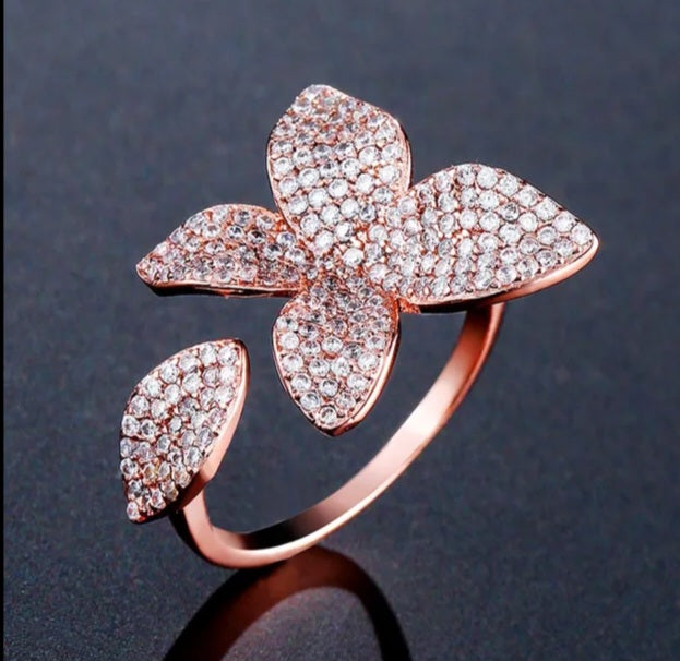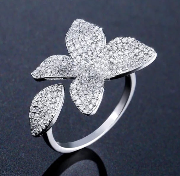Delicate flower petal shaped adjustable ring with silver color zircon.