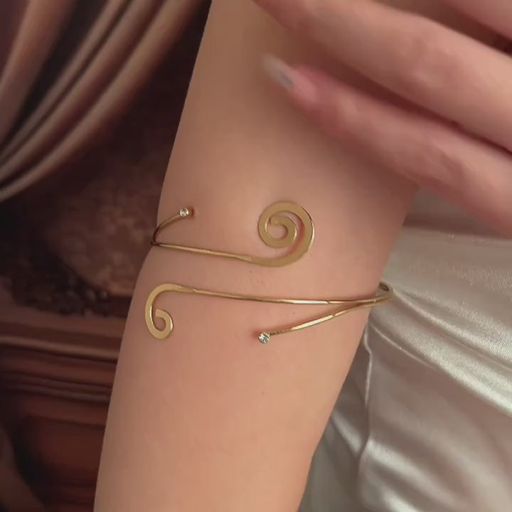 A trendy golden spiral that wraps your arm in effortless luxury. This perfectly sculpted twist adds a bold, modern edge to your look that is impossible to ignore.